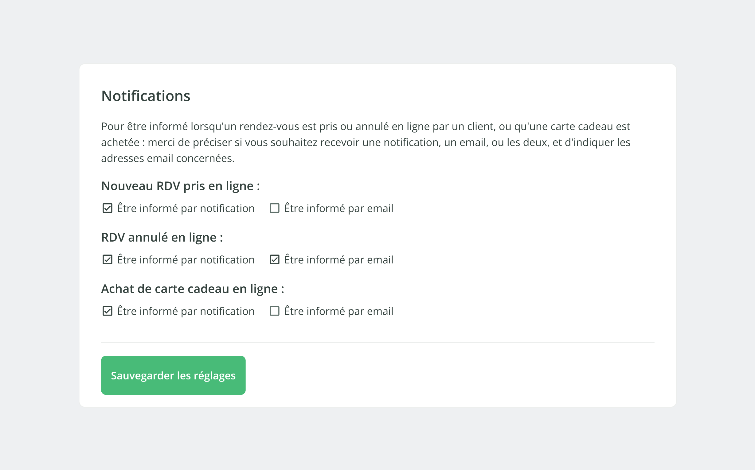 Si vous le souhaitez, vous pouvez choisir de recevoir sur votre ordinateur et votre tablette des notifications et/ou des mails concernant: les nouveaux rendez-vous, les rendez-vous annulĂ©s ou encore lâachat de cartes cadeaux en ligne.